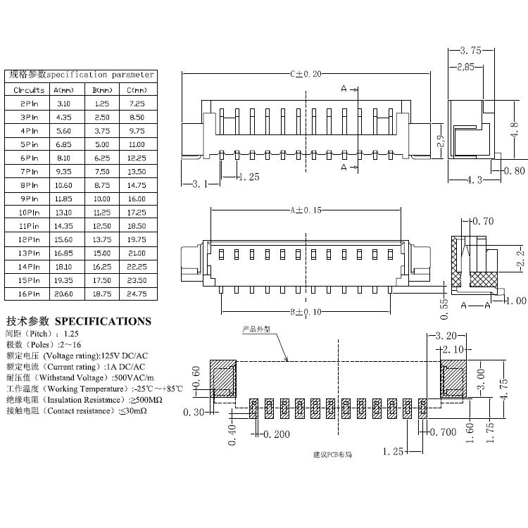 间距1.25-1×nP单排有闭口立贴针座不加盖